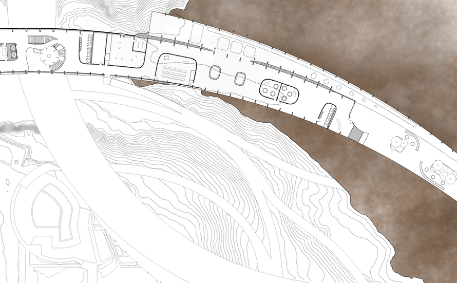 The program consists of office, education, and gathering spaces to be utilized by NOAA: the National Oceanic and Atmospheric Association. Our story and intent with our project was based on the concept of creating new understanding through immersion, exposure, and connection to the site. The passage through the site creates a journey with contrasting experiences. You begin in the upper bar building of the project, where you are immersed underneath the ground-- exposed rock surrounding you. As you travel down, it becomes brighter as you begin to transition out from the ground into the atrium. Traveling down into the bottom bar building, you are now exposed to the site. The bar bridges across allowing you new perspectives of the site. From this bar, pathways branch off and allow you to explore the site; walking passed the restored native landscaping or through the ruins of Sutro Baths. We returned the land to it’s state before the parking existed, recreating the topography that existed before, and are utilizing the existing water shed to collect water under our amphitheater - clearly honoring and emphasizing the palimpsest intrinsic to the baths.